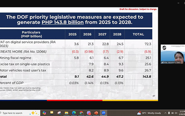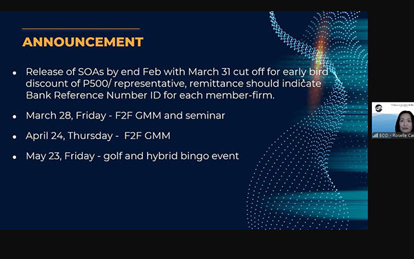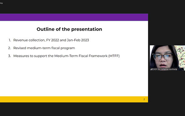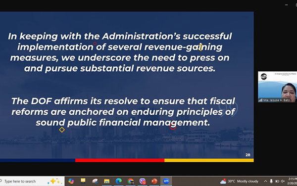 • Ms. Ma. Jesusa A. Bato, representing Hon. Karlo Fermin S. Adriano, Assistant Secretary of Department of Finance, Fiscal Policy and Monitoring Group. She discussed updates relating to the 2025 Fiscal Legislative Agenda of the Department of Finance.